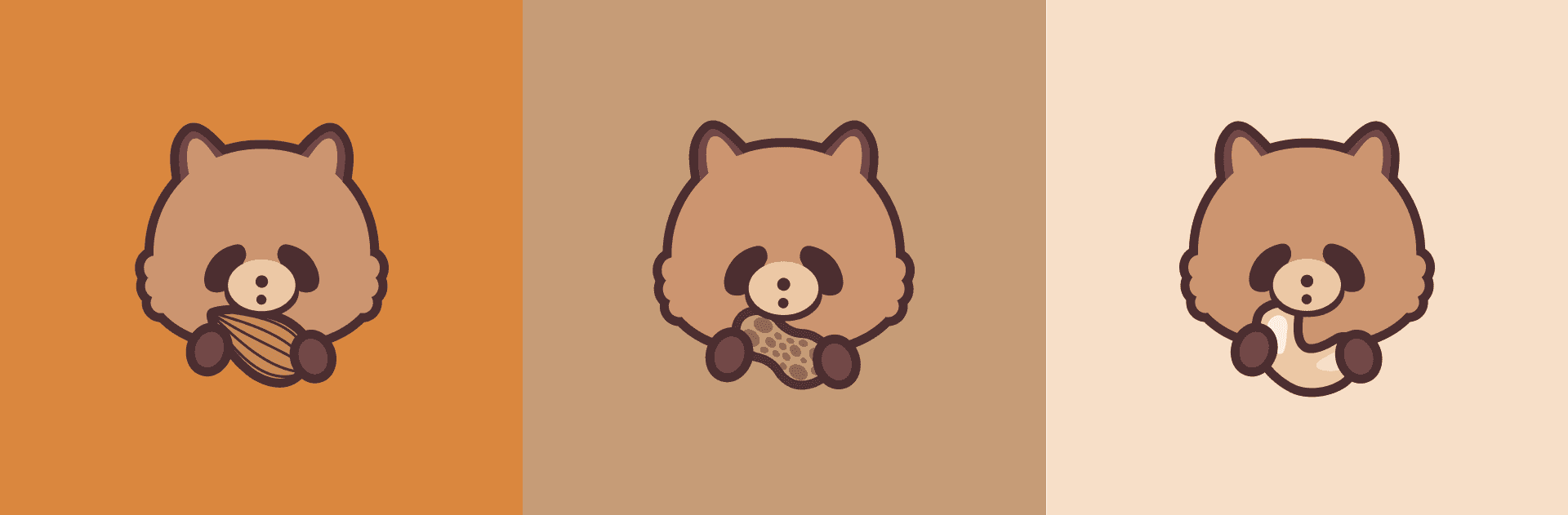 We studied a lot of pre exsiting nut butter brands which helped us come up with a modern brand identity which looks very playful and approachable. We wanted our colour palette to be earthy and warm, and a mascot everyone could relate to; which we narrowed down to a raccoon