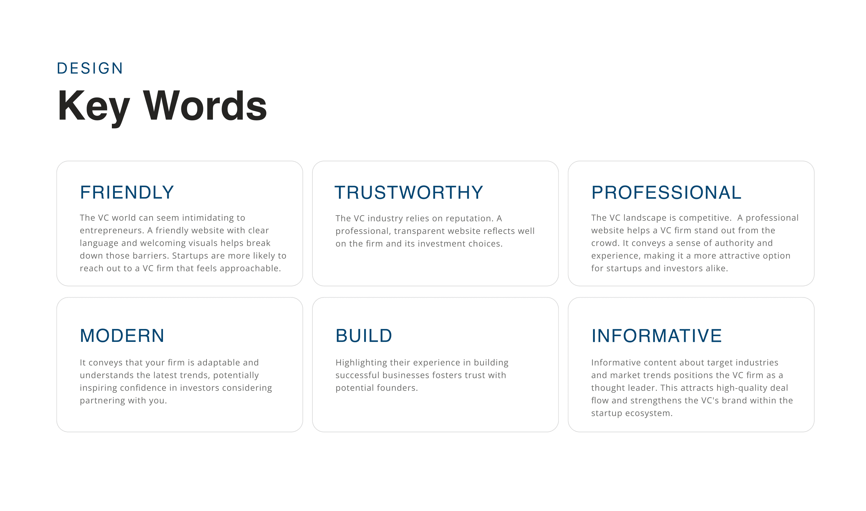 Balancing Trust and Innovation: Convey a sense of trust and stability while also reflecting the innovative nature of the venture capital industry.
